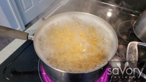 Place the 1 lb. of dry elbows into the boiling pot of water. Cook the pasta for 1 minute less than the package suggestion for al dente (Roughly 8 minutes).