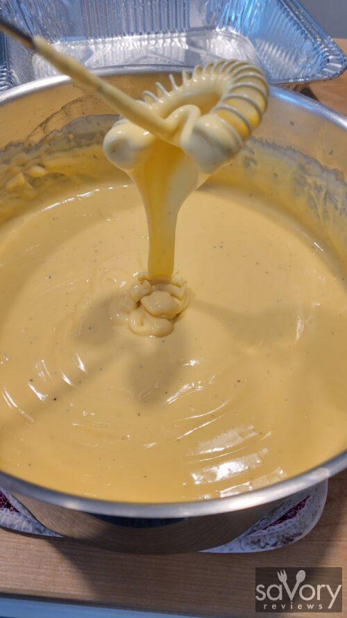 Once you have the nutty aroma of the roux going, add the half and half and whole milk. Whisk constantly until the mixture starts to boil and thickens. Remove from the heat and add the velveeta, 2 cups of cheddar and the worchestershire sauce.